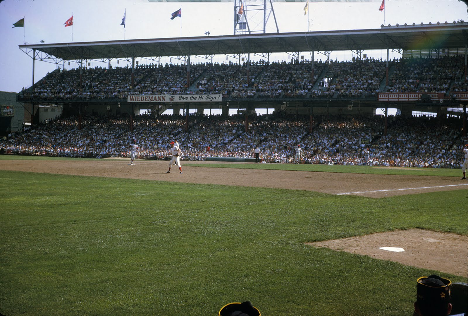 Ever wonder what it would be like to sit in the front row in one of the classic ballparks? Maybe right up against the bullpen, watching the greats warm up and pop that catcher’s mitt? Well, behold the wonder of the internet age, because not one, but two different folks have posted public Picasa (now Google+)  photo albums not only from this final summer at old Crosley Field (they would move into Riverfront in June 1970), but on the exact same day, and we get front row seats, on both sides of the park!