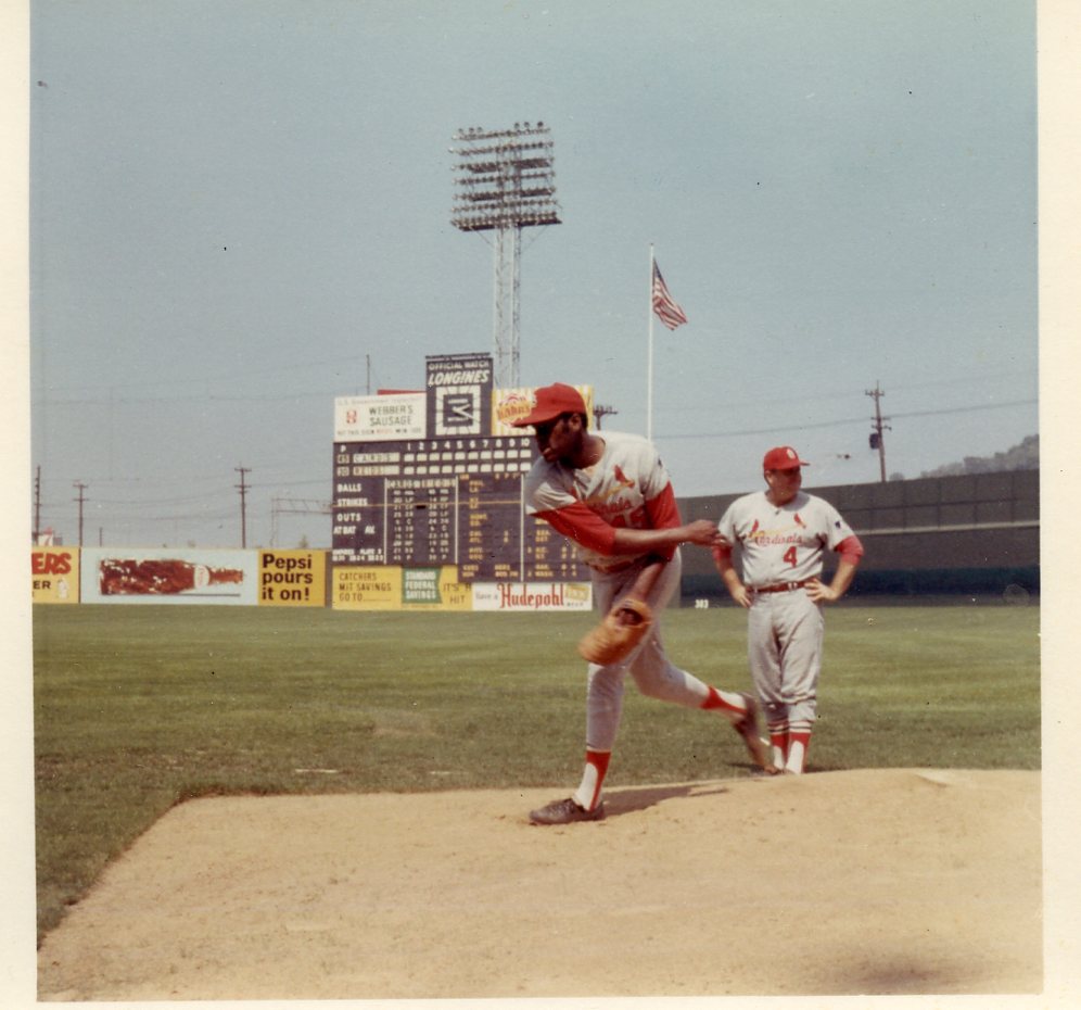 Mudcat Grant warming up in the 7th, seen below, with the Cards down 7-5. He eventually came in to mop up in the 8th.