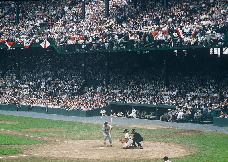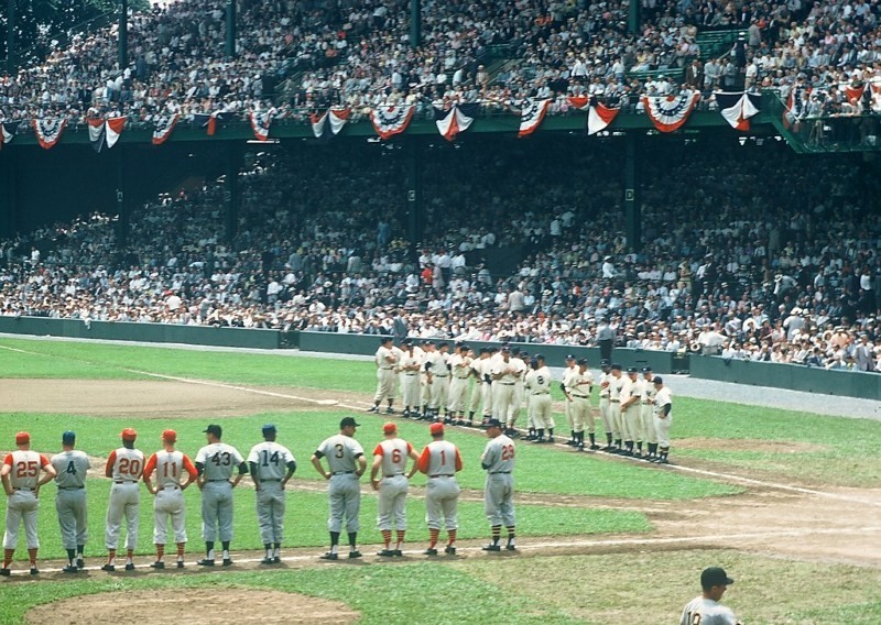 Just a quick post to show off these glorious color fan photos from the 1956 All-Star Game in Griffith Stadium, Washington, DC. It’s all here – the classic dark green of the stands, the beautiful National Bohemian beer ad so prominent in the old park, the striking colors of the uniforms, especially the backs of the National Leaguers (a lot of Reds present with their sleeveless unis, and especially Ted Kluszewski, with no undershirt at all – also a lot of Yankees lined up along the other side), all the pomp and circumstance, and lastly what would have to be Duke Snider batting in the 7th or 8th inning, with the White Sox’ Sherm Lollar catching, and ol’ Casey looking on from the dugout. So pop open a cold “Natty Boh” and enjoy. Box score link at bottom.