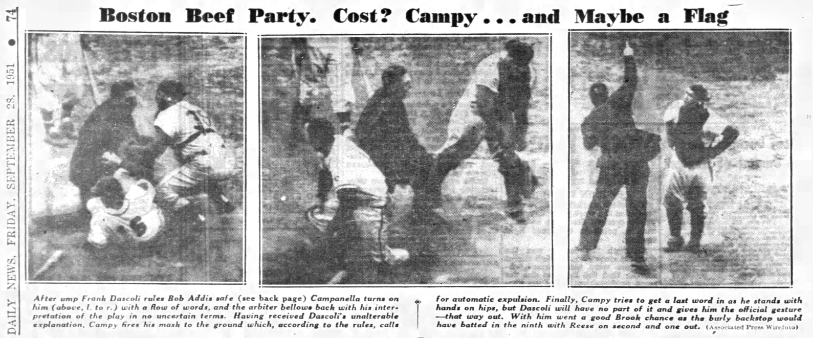 “As Dascoli spread his arms in the safe sign, Campy jumped up and down in violent protest and slammed his glove on the ground. Dascoli instantly thumbed the catcher out, then the dispute grew quickly.”
