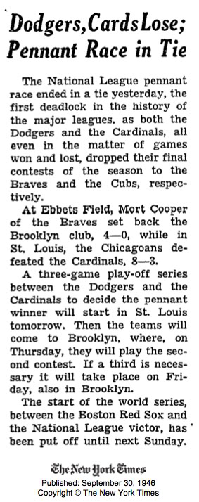 It turned out that each game did matter from here on in, as the Dodgers and Cardinals continued to battle down the stretch, and they both ended the season in a flat-flooted tie, surprisingly, for the first time in baseball history. There would be a 3-game playoff to decide the pennant, which oddly enough, had many parallels to that August stalemate doubleheader.