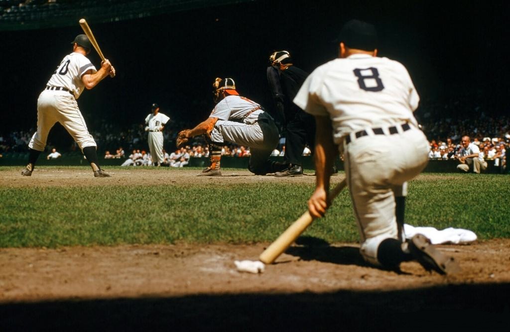 Saturday, June 27, 1959, Briggs Stadium, Detroit. Orioles in town for the third game of a four game set. Tiger C Red Wilson awaits the pitch as SS Rocky Bridges waits on deck. Gus Triandos is the O’s catcher.