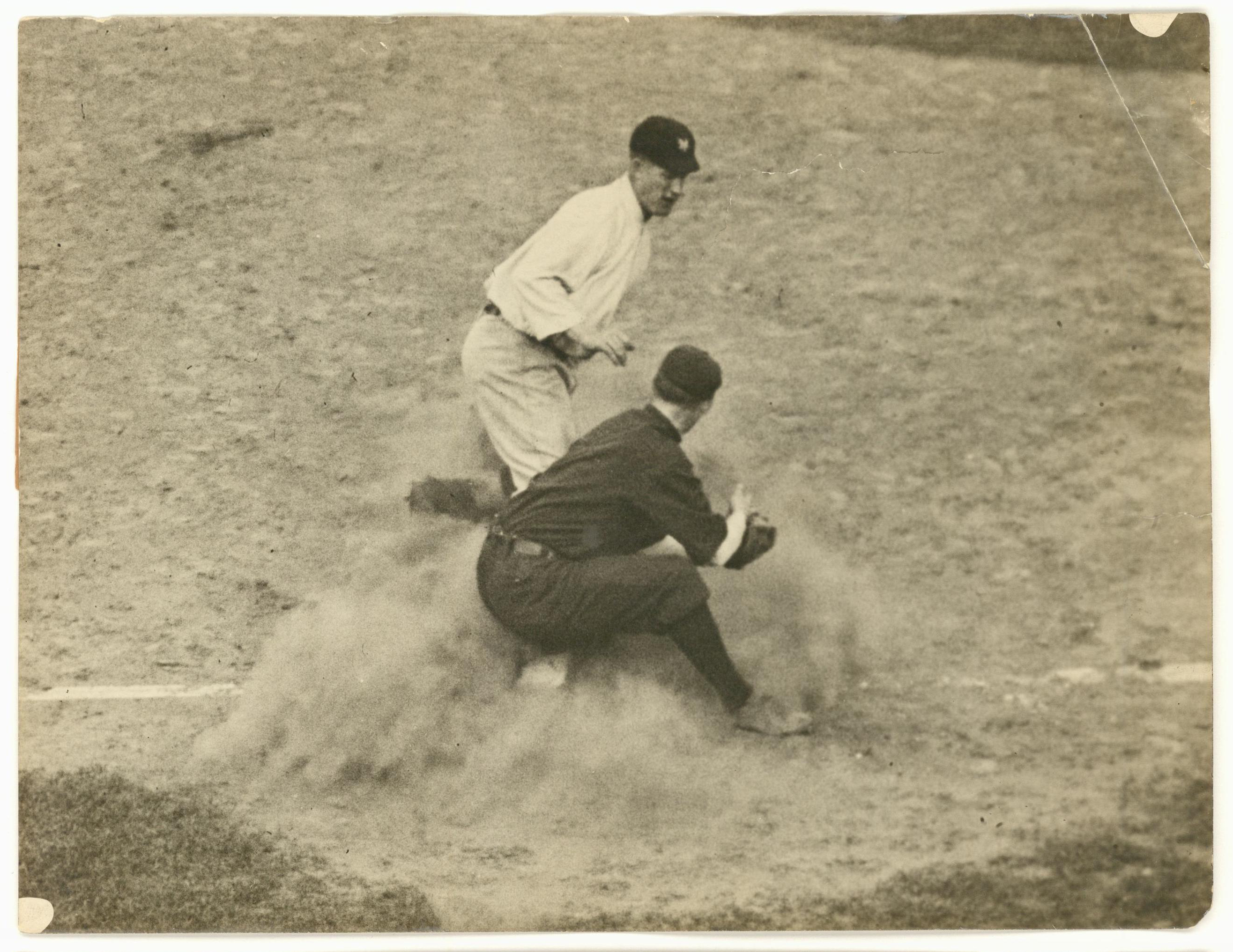 From the caption on the reverse of this photo: Blocking the runner off the base – one of the things resorted to occasionally by a wily infielder. Eddie Grant, the Cincinnati third basemen, received the throw from the catcher far to the right, on his bare hand. He hardly had time to swing around and tag Murray, the premier base-stealer of the Giants, as the latter was almost at the base. So he hurled his body between the sack and the runner, preventing him from reaching the base, which gave him plenty of time to tag Murray.