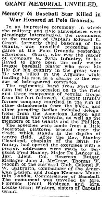 The NY Giants honored Eddie Grant with a memorial plaque, dedicated between games of the Memorial Day doubleheader at the Polo Grounds on Monday, May 30, 1921.