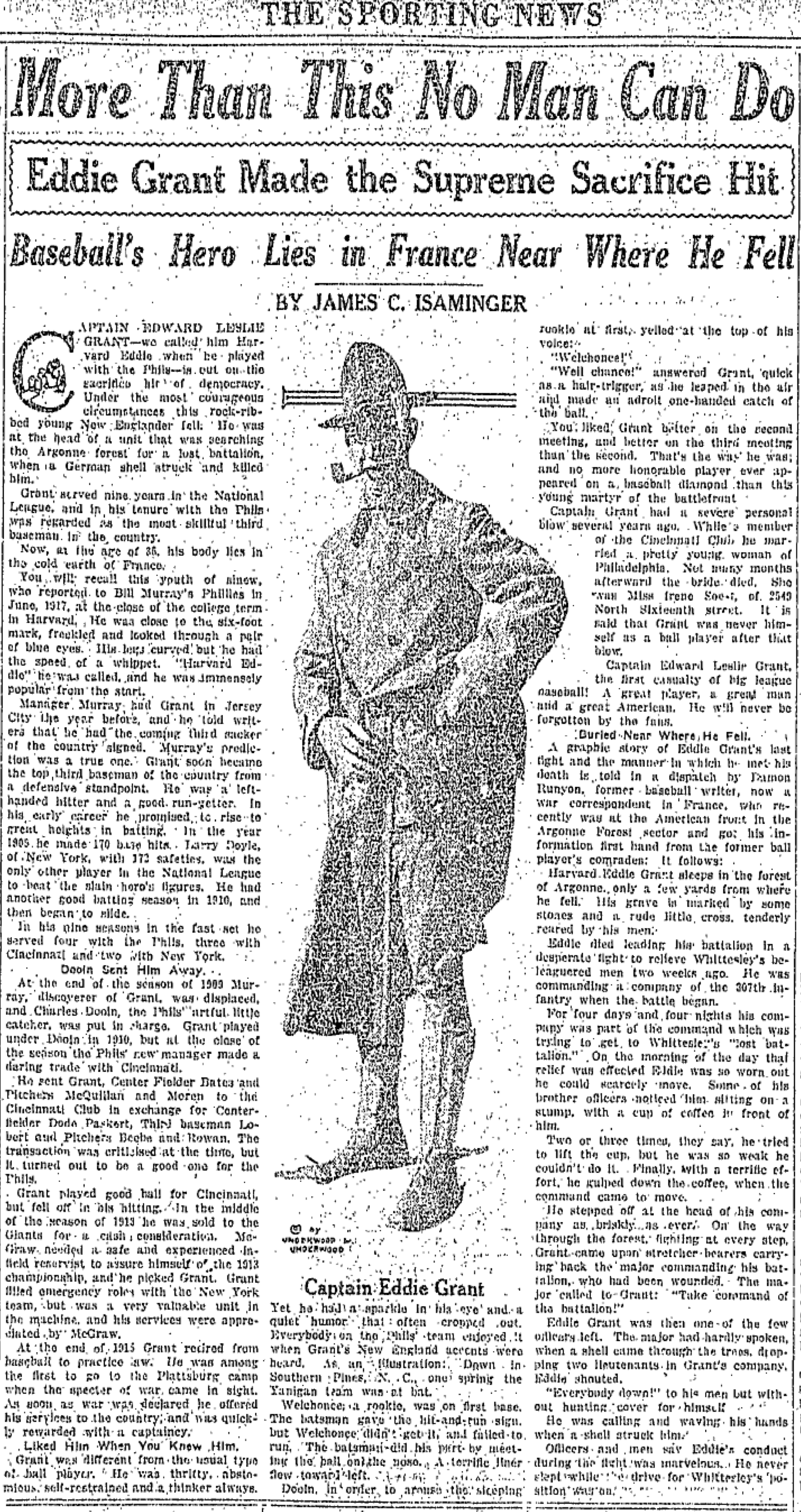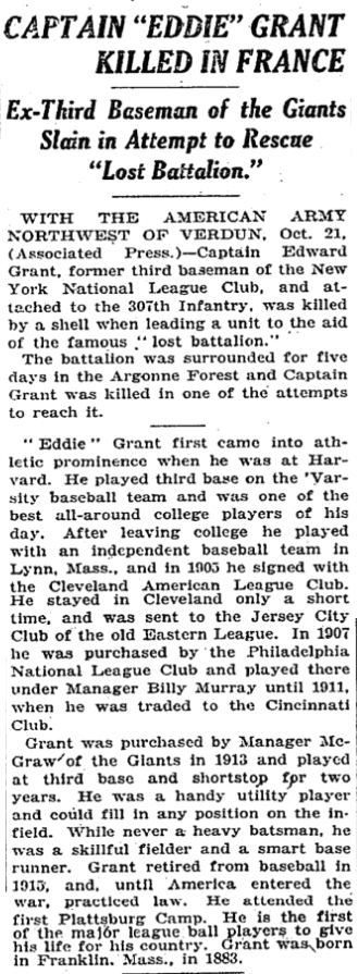 Eddie Grant would sadly thus have another footnote in the annals of major league history – he would be the first MLB player to be killed in action in service to his country.