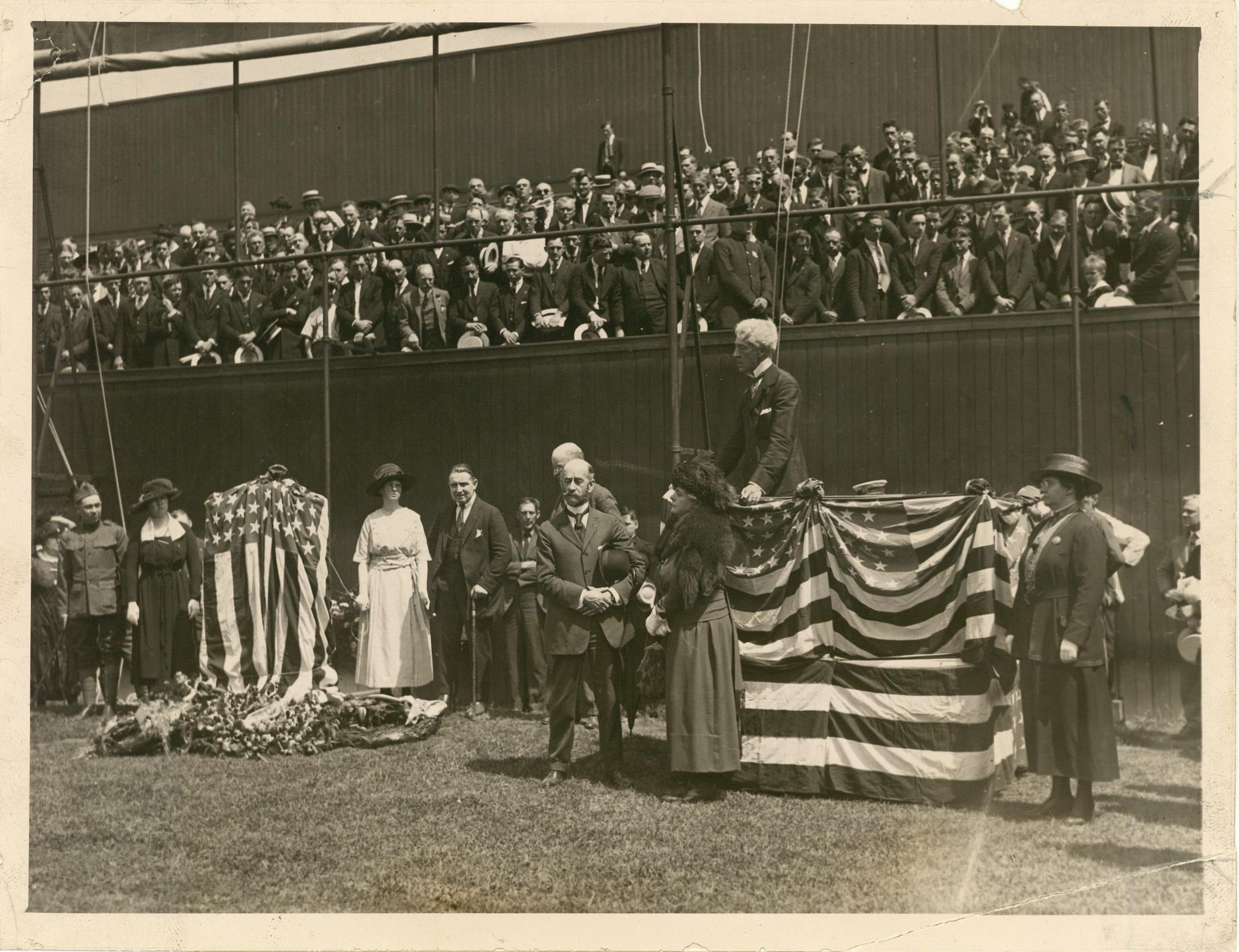 grantplaquededication Memorial plaque dedication ceremony – MLB Commissioner Judge Kenesaw Mountain Landis standing on dais at right, plaque draped with flag at left