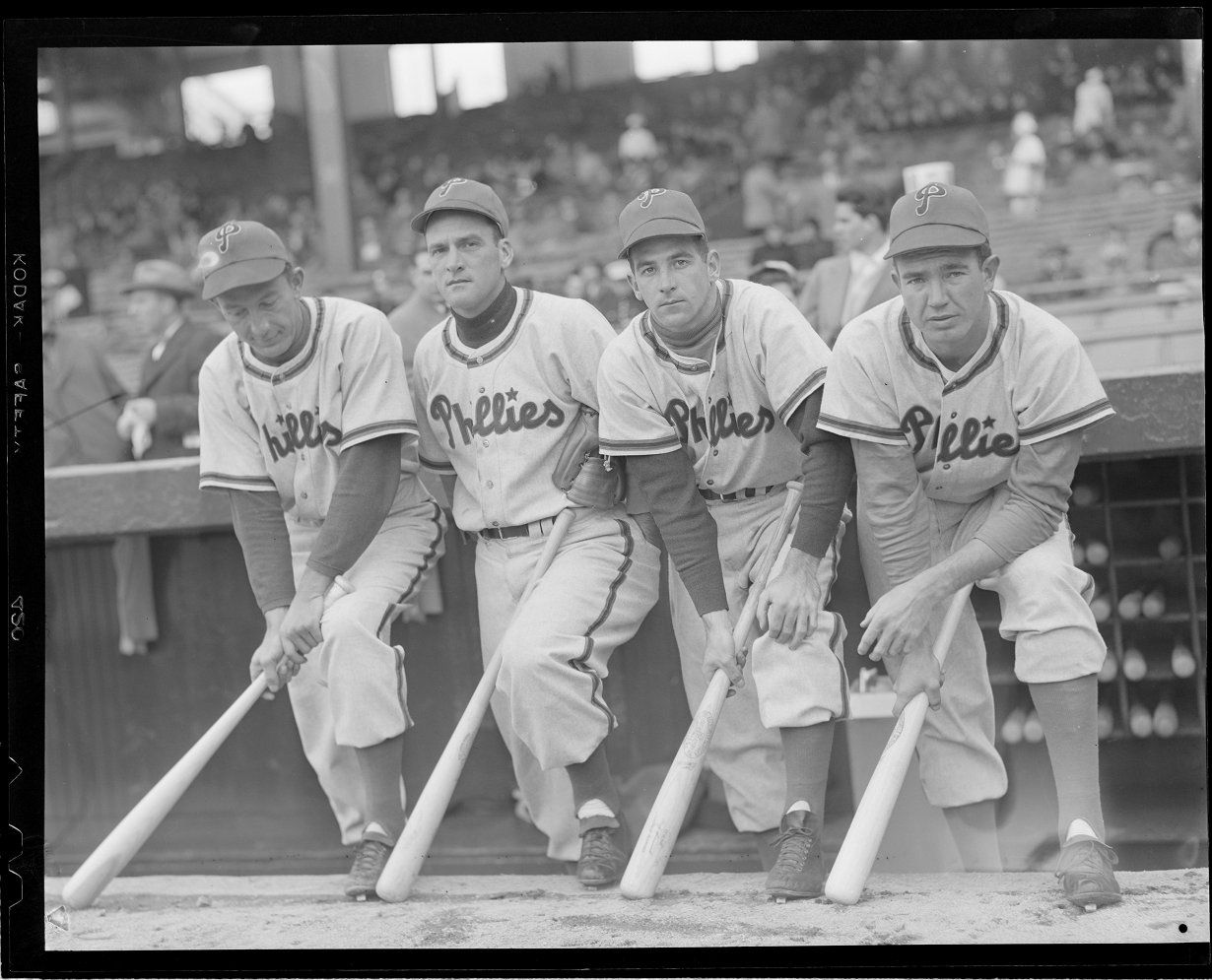 Eddie Miller with Phillies teammates in 1949 at Braves Field – L-R: Eddie Waitkus, Miller, Granny Hamner, Willie (Puddin’ Head) Jones