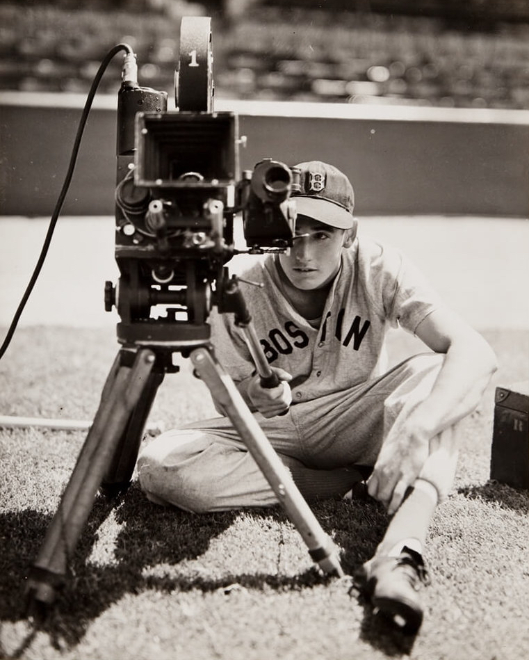 On the occasion of Ted Williams’ birthday 100 years ago today, I’m posting another favorite photo of mine of the Splendid Splinter, from 1942, taken by photographer George Burke, believed to be at Comiskey Park, Chicago. Always a popular subject, Ted is seen peering through the other side of a lens for once, through a movie camera of the era (quite a contraption).