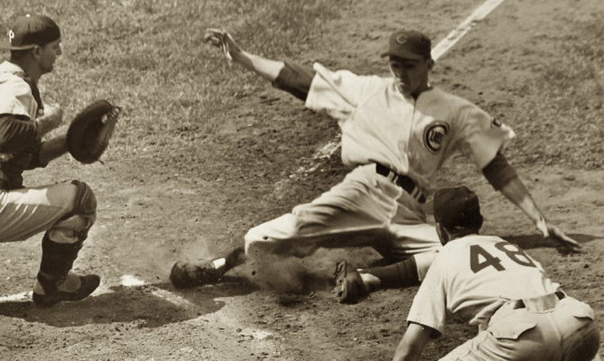 Friday, May 18, 1951, Wrigley Field, bottom of the 4th inning, and the Cubs’ rookie shortstop Jack Cusick barrels into home as Phillies’ catcher Andy Seminick awaits the late throw, and teammate Andy Pafko, who just scored, gives Cusick the slide sign. Cusick would slide in safely to complete a thrilling inside-the-park grand slam home run (only the 2nd HR of his career) to put Chicago up 15-7, in a slugfest on the North Side.