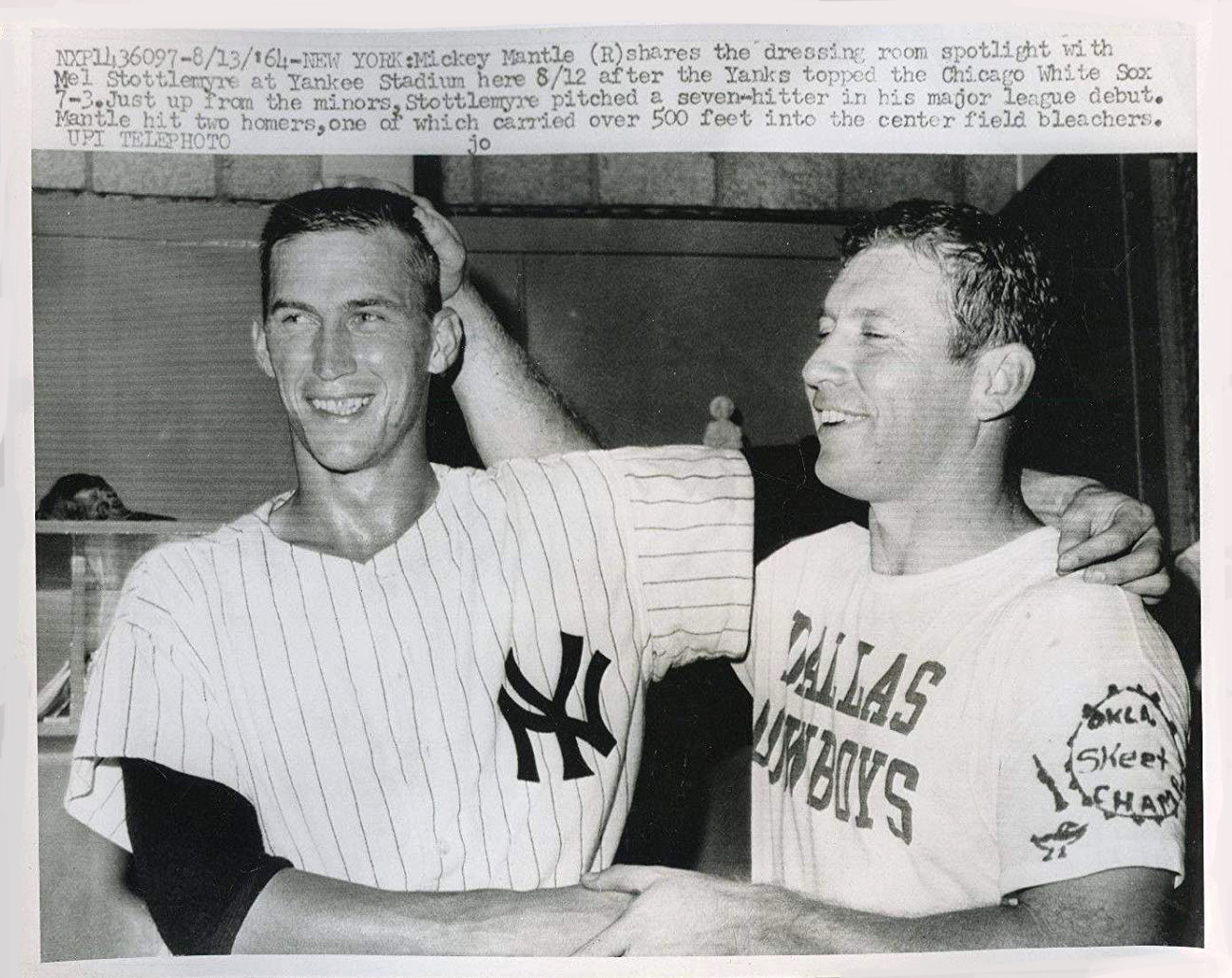 Wednesday, August 12, 1964, and Mel Stottlemyre and Mickey Mantle help celebrate Mel’s debut in the major leagues, a complete-game 7-hit shutout of the White Sox at Yankee Stadium.
