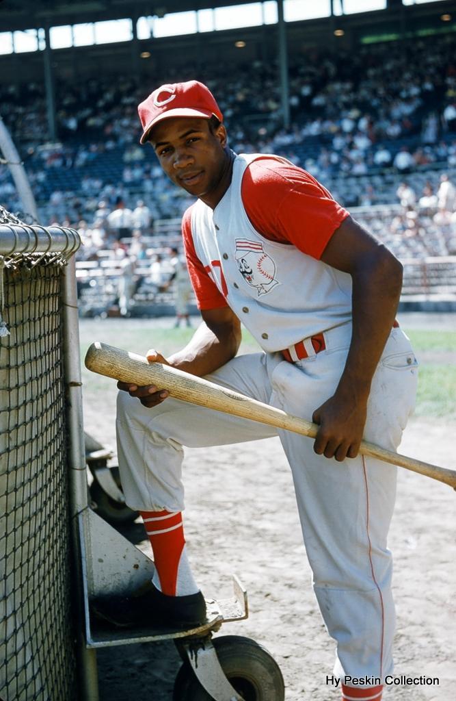 The accolades are many: Rookie-of-the-Year in 1956 (photo above taken August 12, 1956, in County Stadium, Milwaukee by the renowned Hy Peskin) including a then-record 38 home runs by a rookie, and also led the NL in HBP, indicative of his fearless, close-to-the-plate batting style; also, the only player to earn the MVP Award in both leagues, 14-time All-Star, the AL Triple Crown in 1966, 586 HRs (4th all-time when he retired), 2 World Series titles, and of course being the first African-American manager, with the Cleveland Indians in 1975.