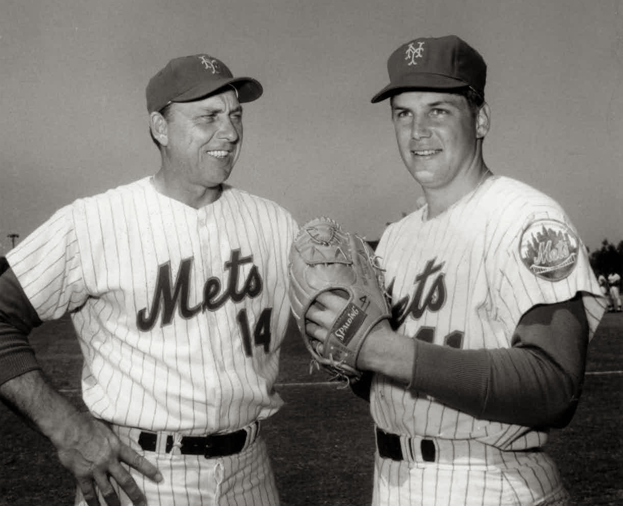 Tom Seaver with Gil Hodges in Gil’s first camp as Mets manager, Al Lang Field, St Petersburg, March 8, 1968, by Bob Moreland of the St Petersburg Times. “No one had more impact on my career…he went about his job in a very professional manner, and it caused me to do the same with my job.” #14, #41 now retired.